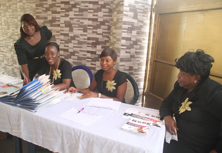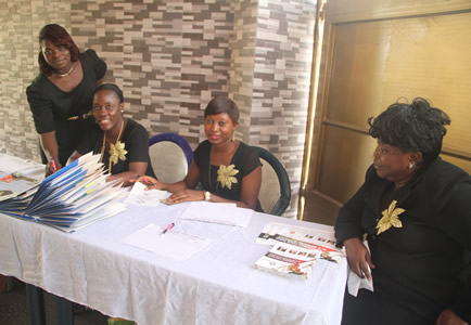 Officials at summit registration desk. |