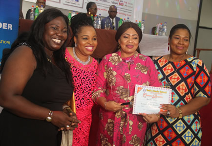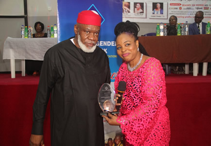 Lady Onyeka Onwenu receiving her award , while others watch in admiration |