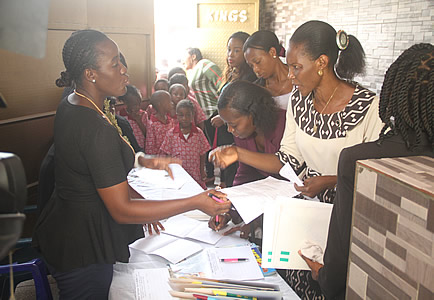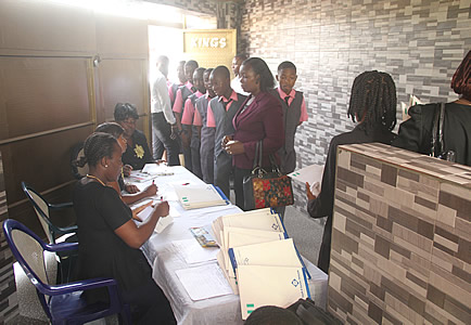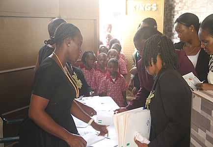 Arrival of various schools at the registration table. |